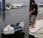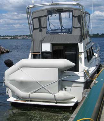 Quick-release and manual release pivot-up davits - Model 6100 & Model 6000 - carry inflatable boats on shallow swim platformsThe Pivot-up Davit System (model 6100) with quick release, or the Pivot-up Davit System (model 6000) with manual release, are both designed to carry an inflatable boat or dinghy on the swim platform of boat as shown in the pictures. This dinghy davit is the highest quality, easiest to install, simplest to use davit system on the market for yachts with shallow-depth swim platforms. "A dinghy davit with no expensive gluing of parts on your dinghy, no hassles, no worries....just go boating!"